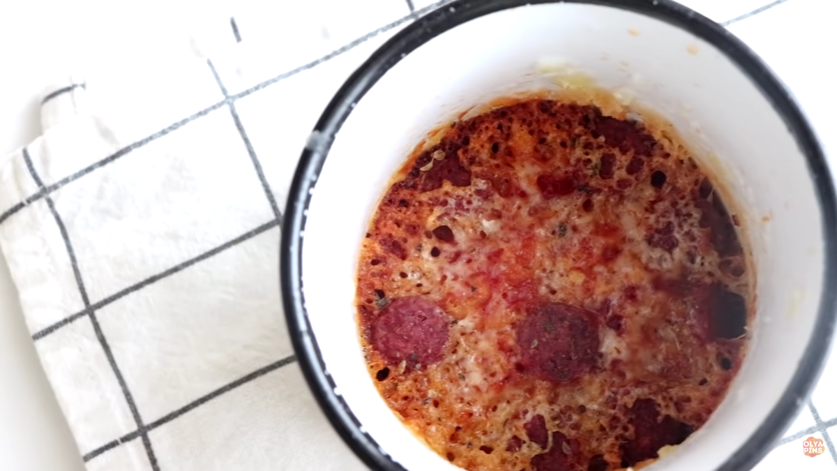 Ингредиенты: Пошаговый рецепт приготовления: 1. В керамическую кружку выкладываем муку и разрыхлитель. 2. Добавляем молоко. 3. Добавляем масло. 4. И перемешиваем до однородного теста. 5. На терке режим сыр, а также колбасу. 6. Добавляем в тесто кетчуп. 7. Выкладываем в кружку сыр и колбасу. 8. И посыпаем специями. 9. Ставим в микроволновку на 3 минуты 10. Готово!