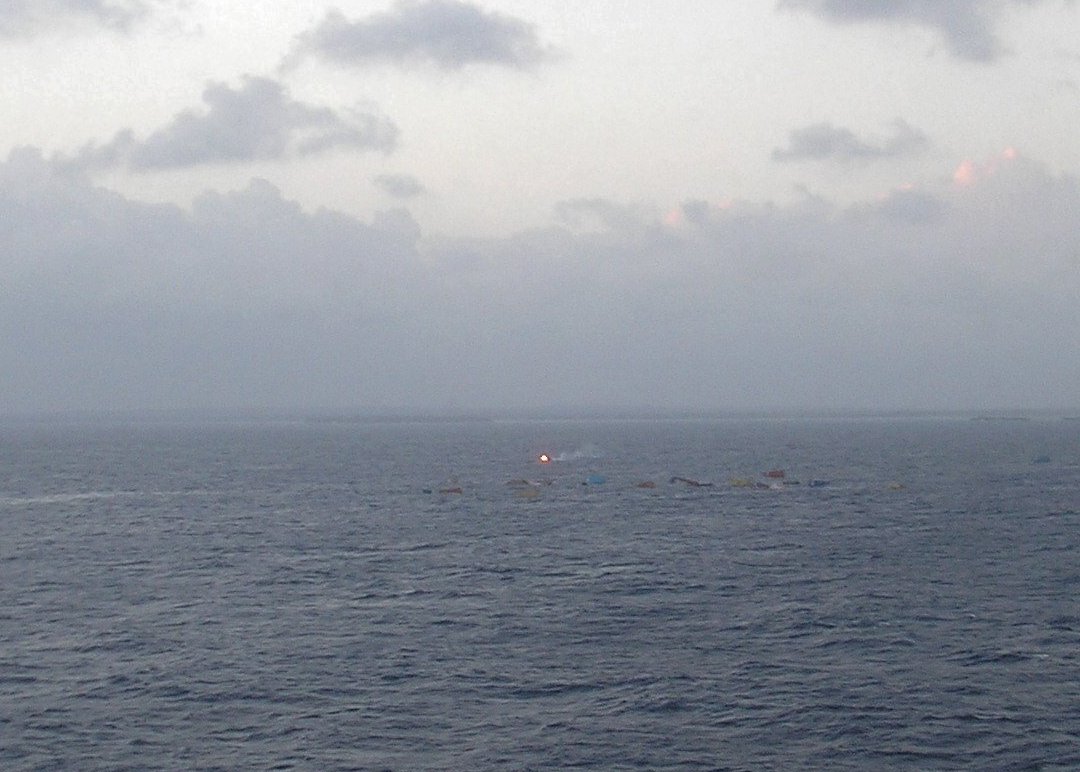 Мы приготовили машину и в 05:18 начали движение в направлении порта, усилив наблюдение в целях осуществления поиска членов экипажа судна Ф. В 05:58 местного времени мы заметили около 20 плавающих в воде контейнеров и среди них – спасательный плот, подающий сигнал бедствия красным фальшфейером.
