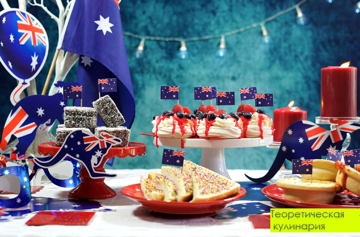 Австралия Австралийская кухня, для нас, может показаться экзотической, потому как там распространены такие блюда как: мясо кенгуру, опоссума, крокодила и других обитателей данного материка. Наибольшее влияние на развитие австралийской кухни оказала британская кухня, привезённая в Австралию первыми переселенцами. Ламингтон Бисквитный десерт с жидкой начинкой и глазурью, которую обычно делают из шоколада и кокосовой стружки. В качестве начинки обычно используются ягоды (малина, клубника), а также взбитые сливки. Дампер Бездрожжевой хлеб, который часто готовили первые европейские переселенцы. В наше время готовится в виде пышной булочки с разнообразными добавками (сыр, зелень, сушеные томаты, специи). ~~ Австралийцы большие любители барбекю, в каждом доме, на каждом участке есть свой гриль. Пусть и кенгурятина у них в обиходе, но предпочтение они отдают говядине и баранине. ~~ Торт "Павлова"