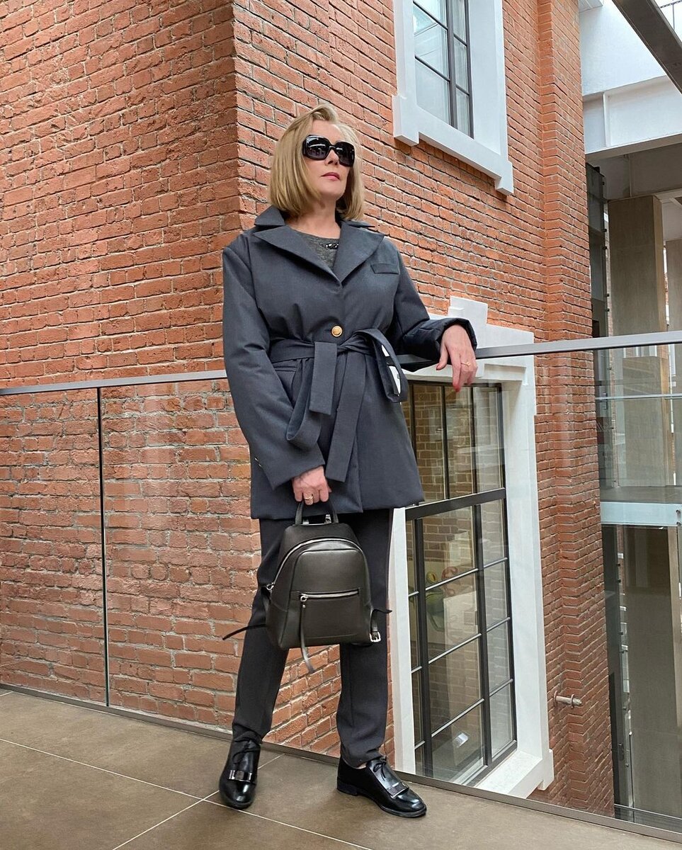 Трикотажные брюки высоко ценятся среди возрастных дам. Такие модные и практичные, они прекрасно подстраиваются под любой стиль одежды, будь то строгий деловой или расслабленный кэжуал. Ниже самые актуальные и уютные осенние образы для женщин 50+. Серые брюки слегка зауженные книзу отлично ладят с одеждой по размеру. Пояс добавит образу женственности, утонченности. Черный городской рюкзак и обувь аналогичного цвета удачно дополняют монохромный осенний сет. Многие зрелые женщины не представляют свои повседневные и офисные образы без брюк широкого кроя. Это выгодная инвестиция в дамский гардероб, поскольку они подходят женщинам с любым типом фигуры. Традиционный черный цвет прекрасно сочетается с яркими, сочными расцветками, принтованными вещами. Присмотритесь к бежевым трикотажным брюкам, которые помогут создать беспроигрышный аутфит на осень. В дуэте с обувью телесного цвета, они зрительно "вытягивают" женский силуэт, делают стройнее. Шарф со звериным принтом подчеркнет вашу индивидуаль