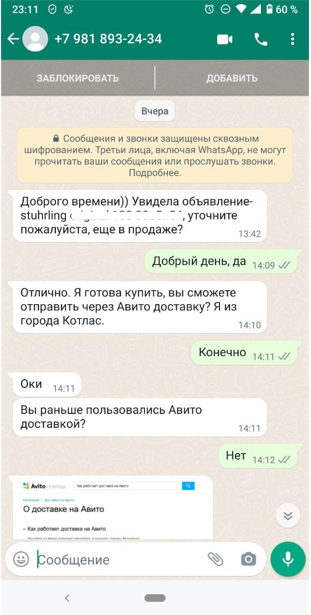 Привет, вот уже третий раз меня пытаются развести на деньги, и я подумал, что может быть будет полезно и вам, почитать как они действуют. Первым делом они пишут через WhatsApp по поводу вашего объявления, что хотят приобрести товар, в моем случае это часы, сообщение выглядит так: Мне написали с номер +7-981-893-24-34 данный номер не показатель, так как они часто могут меняться, потому что покупаются за смешные деньги от 1₽ за номер, его очень легко проверить, попробуйте на него позвонить! Если вам скажут, что данный вид связи не доступен или еще что то в этом роде, то 99% это купленный номер только для подтверждения смс или общения в мессенджерах. Дальше мошенники присылают информацию, что живут где-то в ебунях и готовы оформить авито-доставку и конечно же за все сами заплатят, вам лишь нужно подтвердить оплату по смс) Вот скрин, что пишут дальше: Я ей пишу, что все сам отнесу, дабы не говорить свой адрес, для оформления курьера) Получаю сообщение, что якобы мошенница все оплатила и ж