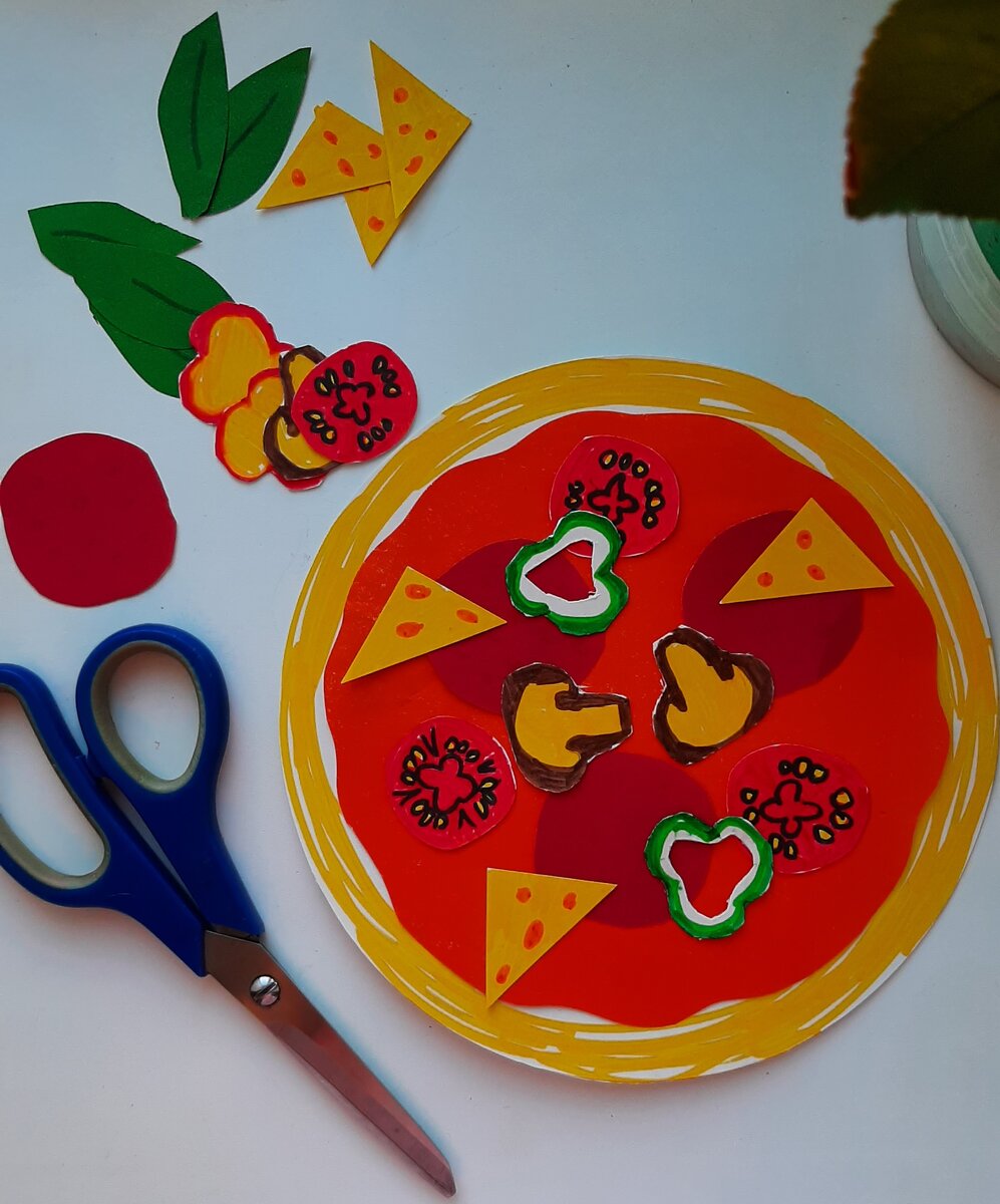 Привет! А теперь играем в "Пиццерию". Сейчас расскажу и покажу как я ее делала. Нам понадобиться: 1. Цветной картон или цветная бумага. 2. Ножницы. 3. Тарелка или циркуль, чтобы ровно нарисовать основу для пиццы. 4. Карандаши цветные или фломастеры, чтобы игра получилась яркая. Из белого картона я вырезала несколько кругов, это будет основа лдя пиццы. "Бортики" я сама нарисовала разными цветами, можно вырезать и из цветного картона. Тут по Вашему желанию. Взяла тарелку меньшего диаметра и вырезала круги, обрезая волнами края - это соус для пиццы. Красный - соус маринара из томатов, желтый какой-нибудь сметанный :-) Ну а теперь начинка. Я рисовала от руки, а потом раскрасила как мне нужно. Тут Ваша фантазия безгранична: помидоры, сыр, перец, грибы, базилик, кусочки колбасы... что придумаете, чем больше начинки, тем больше вариантов пиццы в итоге можно "приготовить". Нам очень понравилась ролевая игра по заказу пиццы. Мой трехлетний пиццайло с творчеством подошел к процессу и стали