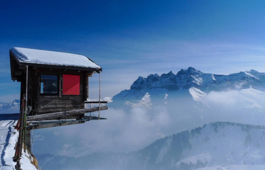Хижина висит на краю скалы, Альпы, Швейцария.