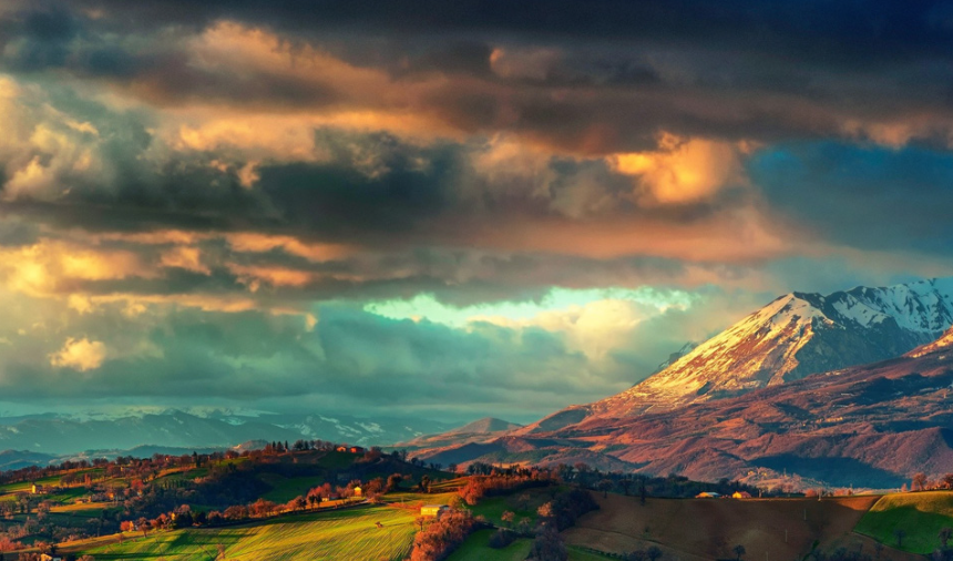 Прекрасный горный ландшафт и драматическое небо, объединились