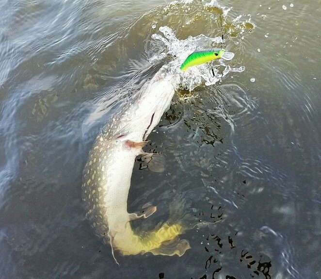 Один продолжает ловить джигом, второй ставит Свингер. Воблер весом 23 грамма летит очень прилично – не хуже, чем компактная поролонка на чебурашке 8-10 граммов, т.е. зона покрытия джигом и воблером получается одинаковой. Одна проводка, другая – и тут на джиг начинается серия результативных поклевок, напарник ловит подряд четыре щуки 2,5-4 кг.