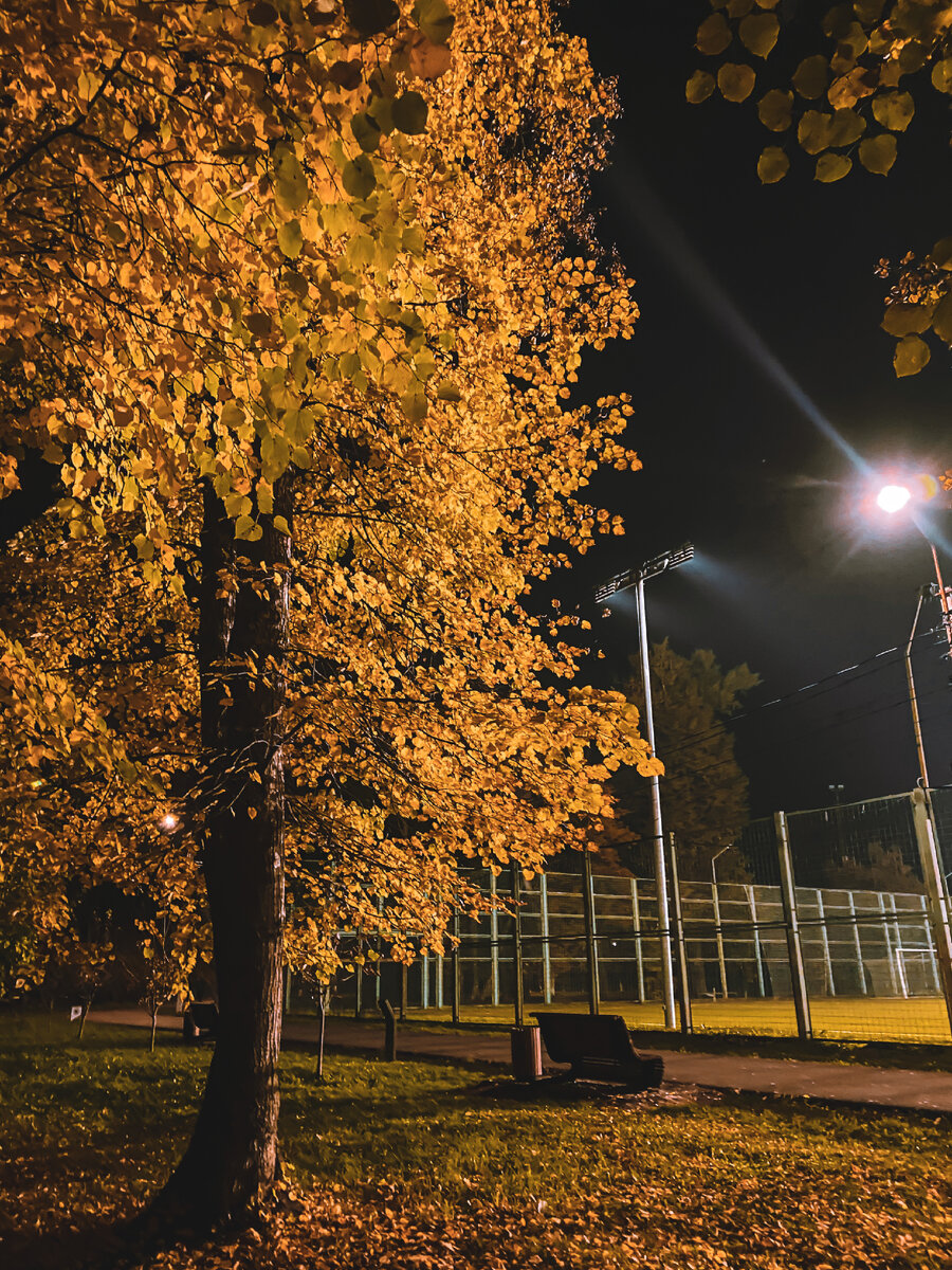 Я уже несколько дней подряд езжу по парковым зонам в Курске и области. И я буду рассказывать вам о них, и в частности поделюсь живописными «осенними» кадрами из своей коллекции. Сейчас речь пойдет о… Курск. Парк 50 летия ВЛКСМ / Боевка. Золотые листья на фоне реки Сейм. Много мест для фотографий как в старой части (по улице Тускарной), так и в новой «Боевке» через пешеходный мост в районе улицы ВЧК у ж/д вокзала. В старой части мало современных мест притяжений, поэтому эта часть парка подойдёт как раз спортсменам, которые любят бегать, а также семьям, парочкам, которые просто хотят гулять вдоль желтых деревьев в приглушённом свете. Хотя, когда включаются прожекторы на футбольном поле, это место играет новыми красками. Этот снимок сделан в режиме ночного фото на телефоне, но вы только посмотрите, насколько тут светло, что даже не скажешь, что дело близилось к 9 вечера. Вспышка не понадобилась даже. Фотолюбителям тут тоже понравится, ведь на земле уже куча листьев и вокруг только при