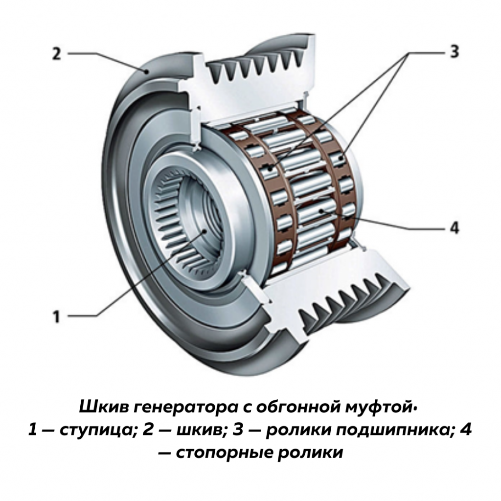 Обгонная муфта генератора — это устройство, обеспечивающее плавность хода и независимое вращение вала и шкива внутри механизма генератора при их однонаправленном движении.