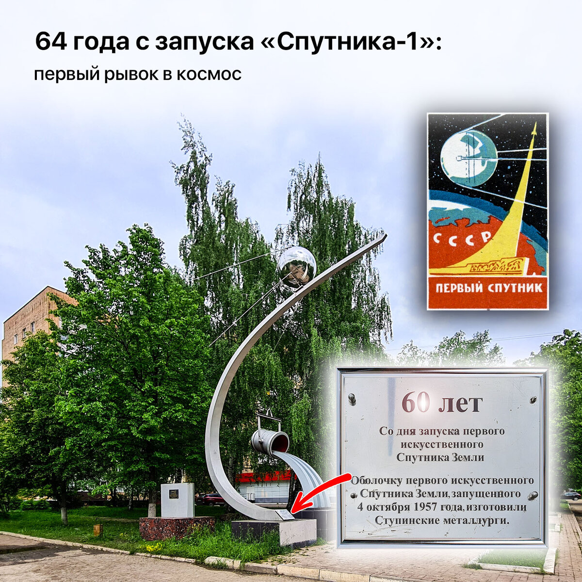 4 октября 1957 года с Пятого научно-исследовательского полигона Министерства обороны СССР Тюратам (в будущем космодром Байконур) был запущен первый искусственный спутник Земли. Кодовое название спутника — «ПС-1» («Простейший Спутник-1»). В историю он вошёл как «Спутник-1». Космический аппарат представлял собой две полые полусферы диаметром 58 см и толщиной 2 мм. Обшивку из алюминиево-магниевого сплава с отходящими от неё антеннами создали на «Ступинском металлургическом комбинате». В разработке технологии штамповки участвовали начальник цеха № 63 Юрий Юткин и его заместитель Валентин Антоненко (прадед Романа Дронова — одного из наших редакторов). «СМК» был выбран из-за того, что там было самое передовое оборудование — на заводе был произведён самый первый в СССР прокат титана. Фото: Pro Космос, памятник в г. Ступино