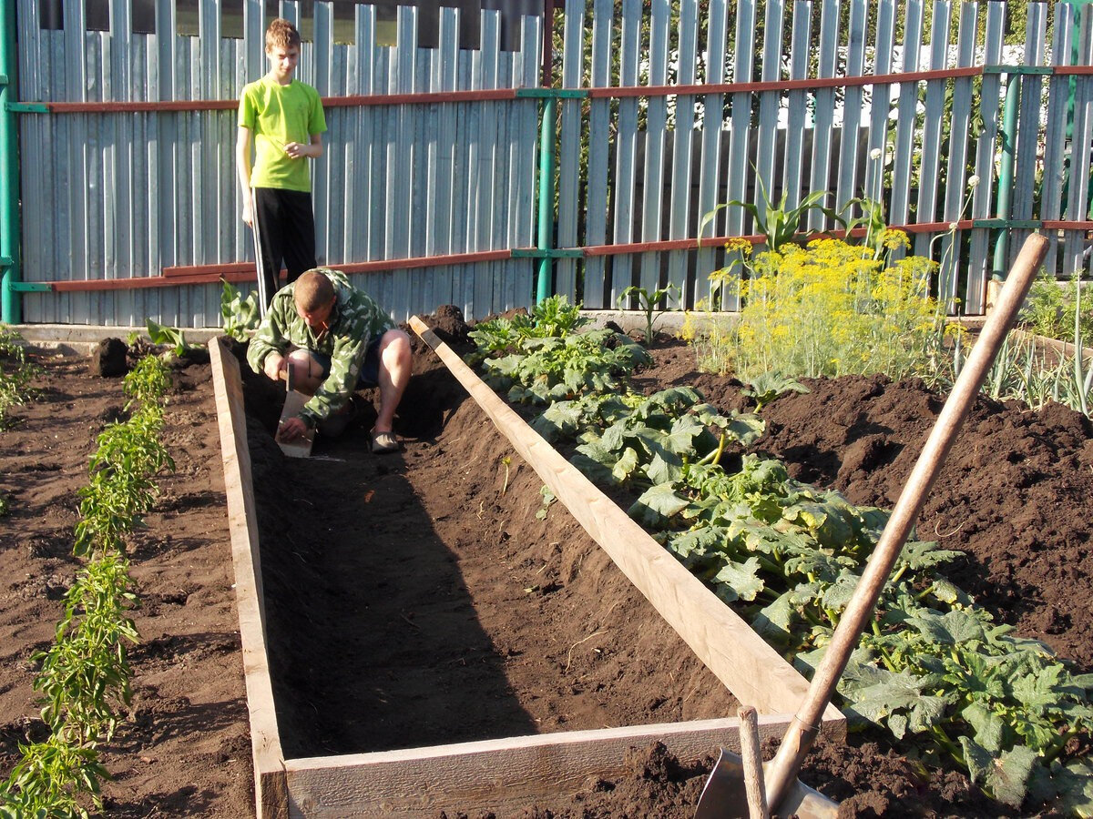 Сразу отмечу, что у меня на огороде грядки довольно высокие, а делаю я их в коробах из обычных деревянных досок длиной 6 м и толщиной 40-50 см. Чтобы доски не портились и не гнили от влаги – покрываю их обычным отработанным машинным маслом.