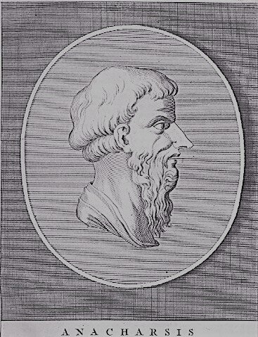 Анахарсис (638 - 559 гг. до н.э.) Скифский мудрец. Происходил из скифского царского рода. Ему приписывают изобретение гончарного круга и якоря, а также игры в шашки. Много путешествовал. Был предательски убит собственным братом Савлием. ------------------------------------------------------------------------------------------------- Гончарный круг. Устройство для формирования посуды и керамических изделий, позволяющий использовать инерцию вращения для создания формы изделий и повышения производительности труда. Ручной гончарный круг одной рукой вращают на вертикальной оси и формируют изделие другой рукой. Ножной гончарный круг приводят в движение с помощью махового колеса, расположенного внизу, которое вращают ногами. При этом обе руки гончара остаются свободными, что позволяет формовать изделия не только спиральным налепом жгута, как на ручном гончарном круге, но и вытягивать из целого куска глины. Изобретение и распространение гончарного круга привело к появлению и обособлению спец