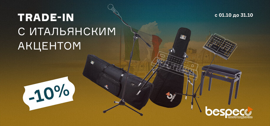 Что способно приумножить радость от удачно выбранного подходящего инструмента или акустики? Безусловно, соответствующие аксессуары, без которых так некомфортно, а порой и вовсе невозможно обойтись! Даже спустя годы многие инструменты продолжают служить нам верой и правдой, но при этом мы оттачиваем свои навыки, осознаём, как действительно удобно и правильно играть, а также понимаем, в каком направлении развиваться. Это требует и переосмысления подхода к аксессуарам, ведь они должны отвечать актуальным потребностям — быть более прочными, более функциональными, более надёжными или даже расширять наши возможности за счёт специфических особенностей новых моделей. Воспользуйтесь нашим октябрьским предложением по апгрейду столь важных и нужных аксессуаров! До 31 октября 2021 года принесите ненужный аксессуар в один из наших салонов и получите скидку 10% на товар Bespeco такого же типа. Принимаем образцы любого года выпуска, любого производителя и в любом состоянии. Кроме того, данное предлож