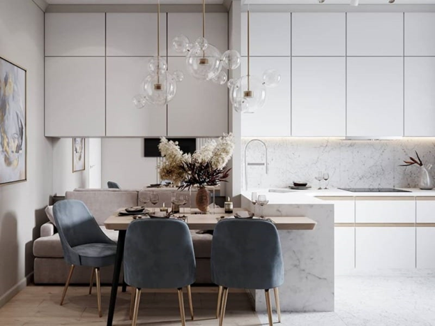 Популярен также вариант единого, неделимого пространства, когда зоны не выделяют ни перегородками, ни мебелью. При этом, одну из зон максимально маскируют, делая незаметной. Проще всего «скрыть» кухню. Для этого приобретается кухонный гарнитур с гладкими фасадами и фартуком цвет-в-цвет, которые выглядят, как оригинальная отделка стен.