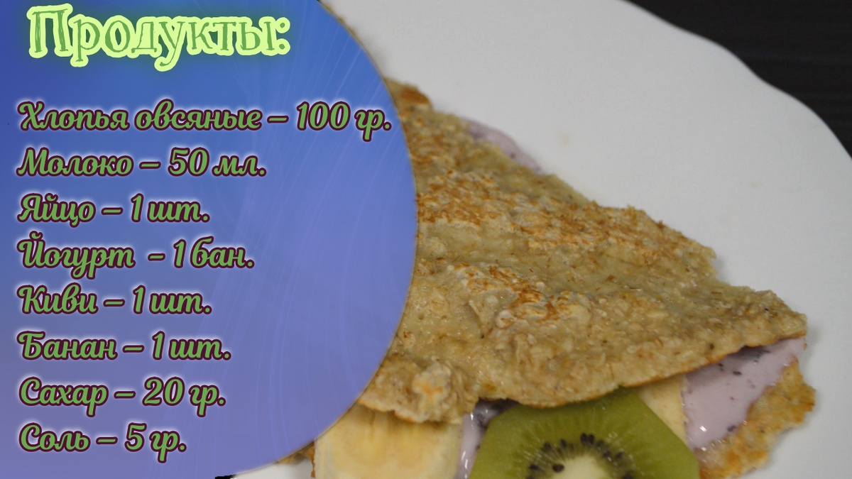 Здравствуйте, сегодня мы с вами будем готовить интересное блюдо из всеми любимой овсянки - Овсяноблин Если вам лень читать, то вы можете посмотреть этот видео-рецепт: Для приготовления этого блюда нам понадобятся следующие продукты: Берем овсяные хлопья и заливаем их молоком, туда же разбиваем одно яйцо, добавляем 1 ч.л. сахара и перемешиваем все до однородной массы, дав настояться овсянке 10 минут. фото листать вправо ›››››››››››››››› Тем временем, пока наша овсянка напитывается влагой, мы нарезаем пластинками фрукты: банан и киви (фрукты конечно могут быть абсолютно разными) фото листать вправо ›››››››››››››››› Приступаем к жарке блина. Разогреваем сковородку, наливаем туда немного растительного масла, выкладываем нашу овсянку, слоем примерно 5 мм., и жарим до подрумянивания примерно 2-3 минуты. фото листать вправо ›››››››››››››››› Одну сторону смазываем йогуртом и выкладываем на него фрукты фото листать вправо ›››››››››››››››› Накрываем фрукты другой стороной. Выкладываем его на та