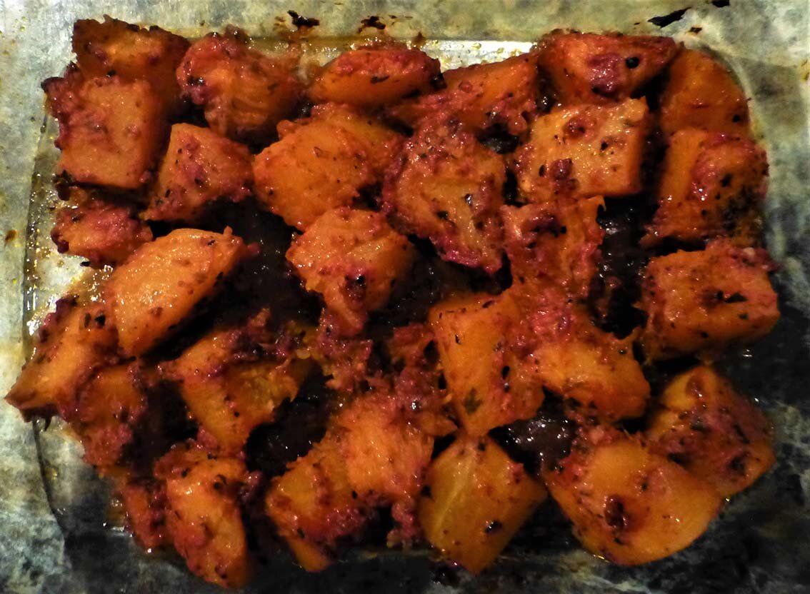 соль и перец по вкусу. Тыкву очистить и нарезать крупными кубиками. Обжарить в оливковом масле со всех сторон до румяности (6-7 минут). Всыпать сушеный базилик, соль и перец, перемешать. Добавить томатную пасту, затем измельченный чеснок. Все перемешать и выложить в форму для запекания. Влить две ложки воды, накрыть фольгой и отправить в разогретую до 180 градусов духовку на 25-30 минут.