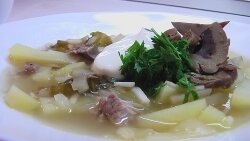 Приготовленно по рецепту из "Книга о вкусной и здоровой пище" РАССОЛЬНИК С почек снять жир и пленки, разрезать каждую почку на 3-4 части, обмыть, положить в кастрюлю, залить холодной водой и вскипятить. Потом воду слить, почки еще раз обмыть, вновь залить холодной водой и поставить Варить на 1-1 1/2 часа. Очищенные коренья и лук нашинковать в виде соломки и поджарить на масле в суповой кастрюле. После этого кастрюлю снять с огня, положить в нее очищенные и нарезанные ломтиками соленые огурцы и картофель, нарезанный брусочками, залить процеженным бульоном и на 25-30 минут поставить варить. За 5-10 минут до окончания варки в рассольник добавить (для остроты) процеженный огуречный рассол, нарезанный щавель (или салат) и соль. При подаче к столу в рассольник положить почки, нарезанные ломтиками, сметану или сливки и мелко нарезанную зелень петрушки или укроп. Рассольник можно приготовить на мясном или курином бульоне и подать с куском телятины, баранины, курицы. Вместо почек можно использо