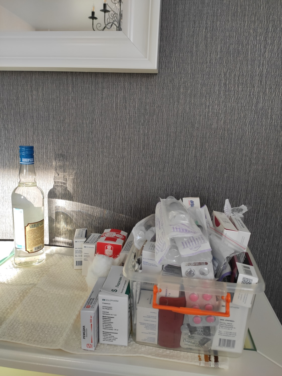 Нет, это не наша домашняя аптечка. Это то, что в течение 10 дней нужно будет влить в меня, чтобы я смог вернуться к нормальной жизни. Здесь лекарств на 10000 рублей: малоиспытанные антивирусы, запрещённые у себя на родине из-за страшных побочек и разрушающие человеческую РНК, сильные антибиотики, убивающие всё, что двигается, гормоны и куча других ядов. Наверное, так выглядит курс химиотерапии для онкобольного.