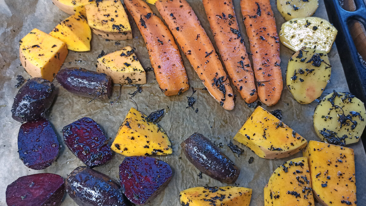 Здравствуйте, дорогие читатели. Сегодня хочу вам рассказать о своих экспериментах с запеканием овощей. Вкусно получилось не сразу, некоторые попытки были съедобными, но не совсем удачными. Но в конце концов я добилась желаемого результата. Сейчас я расскажу какие овощи я запекала, а в заключении напишу какие выводы сделала, чтобы получилось вкусно. Если у вас будут какие-то дополнения, я с удовольствием почитаю ваши комментарии. Сначала расскажу что сегодня запекала и что получилось. Запекала лук, морковь, свёклу, картофель, яблоко, тыкву. Так как свёкла у меня очень мелкая, я специально её не выбросила, а оставила для запекания, я выложила её одновременно с другими овощами. Морковь выбрала цилиндрическую, чтобы она равномерно пропеклась. Я выложила на противень всё, кроме яблок. Яблоки разрезала на 4 части и оставила ждать своей очереди. Сначала все овощи порезала, посолила, добавила перец, сушёный базилик (это может быль другая приправа) и совсем немного оливкового масла. Дала постоя