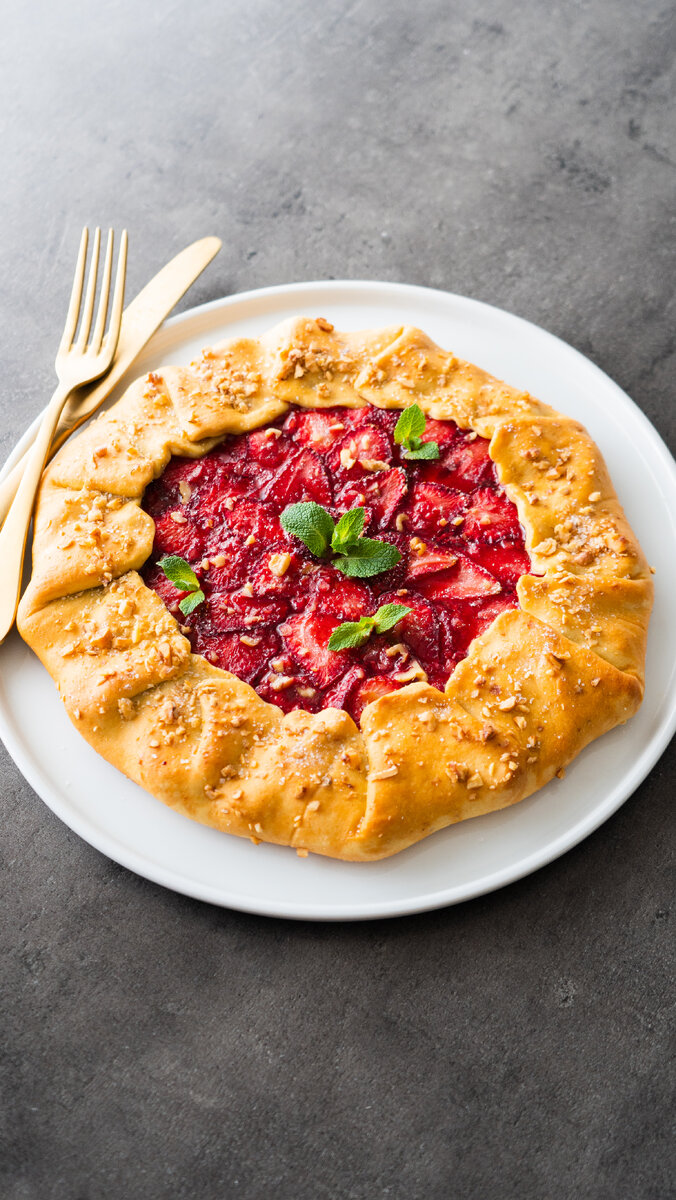 Делюсь с вами рецептом галеты на скорую руку. Обычно тесто для этого десерта делают песочным, из-за чего оно получается более сухим и очень хрустящим. Но в моем рецепте мы будем готовить очень простое, но вкусное тесто, которое при выпечке не будет крошиться. Корочка у нашей галеты получится нежной внутри и хрустящей снаружи. А если подать кусочек этого десерта с веганским (постным) ванильным мороженым… Просто невероятно вкусное сочетание! Ингредиенты: 180 гр. веганского кокосового сливочного масла 300 - 320 гр. пшеничной муки 90 мл ледяного соевого молока 1 ст. ложка сахара 1/4 ст. ложки соли Щепотка корицы Щепотка мускатного ореха Для начинки: 50 гр. очищенных грецких орехов 300 - 400 гр. свежей клубники 3 ст. ложки сахара 3 ст. ложки кукрузного крахмала Сахарная пудра Для смазывания: 1 ст. ложка кленового сиропа 1 ст. ложка соевого молока Для подачи: Листья мяты Веганское ванильное морожено Alpro Способ приготовления: В фуд-процессоре смешать все ингредиенты для теста, кроме соевого