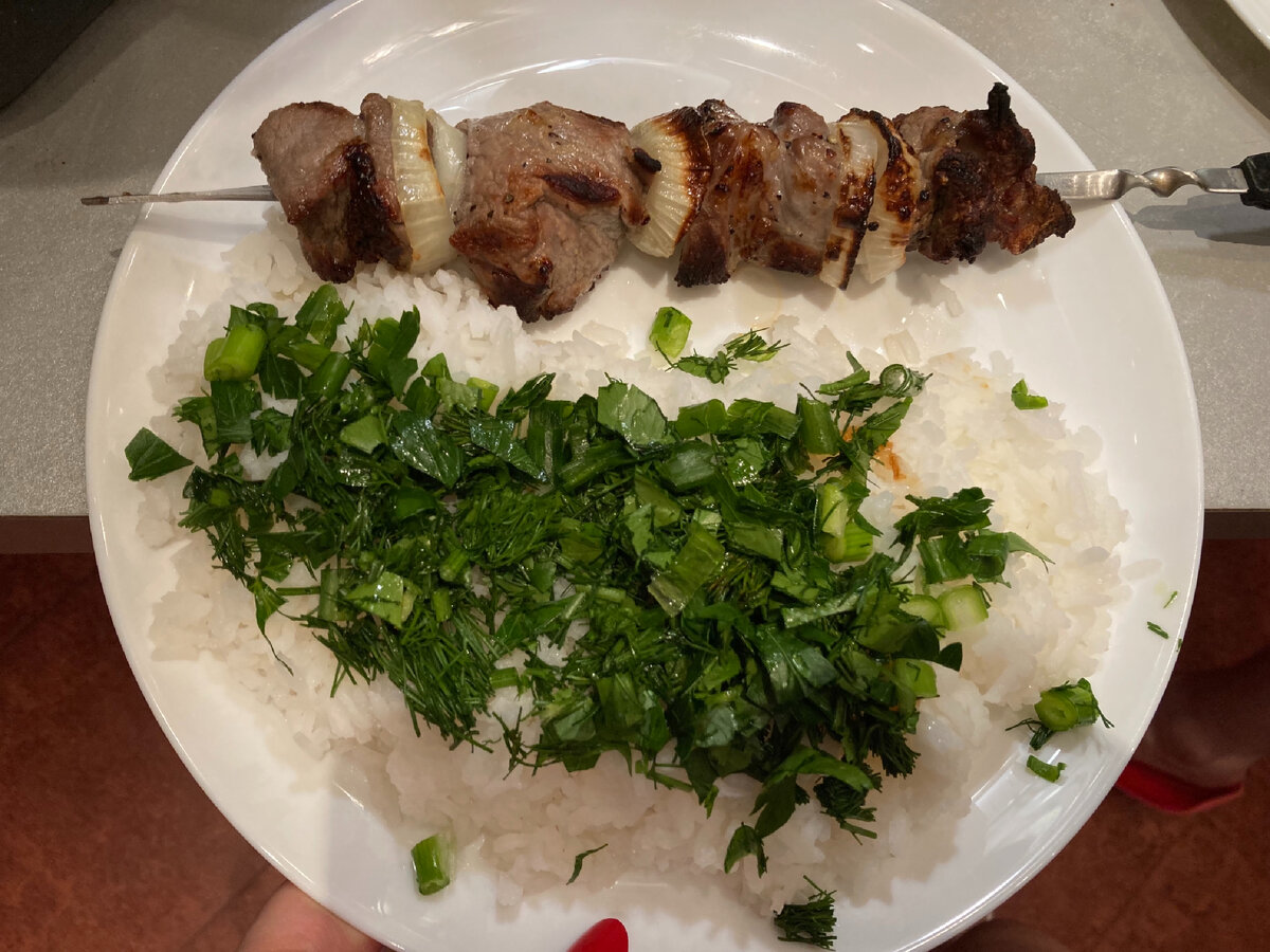 Муж приготовил в квартире вкусный шашлык. Да ещё с таким гарниром. Впервые вижу такой способ варки риса.