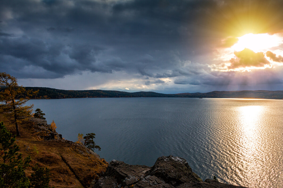 Суровый холодный октябрьский вечер на красивейшем озере Южного Урала наполненный красками золотой осени