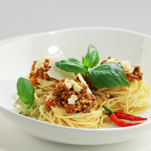 Ингредиенты Спагетти400 г Сливочное масло50 г Чеснок2 зубчика Морковь30 г Стебель сельдерея20 г Белый репчатый лук30 г Говяжий фарш500 г Белое сухое вино50 мл Томаты в собственном соку без кожицы300 г Вода200 млПетрушка5 г Пармезан30 гОливковое масло20 млСоль по вкусуСвежемолотый черный перец по вкусу Приготовление Чеснок и петрушку измельчите. Морковь, лук и сельдерей нарежьте мелкими кубиками. Помидоры разрежьте пополам.
