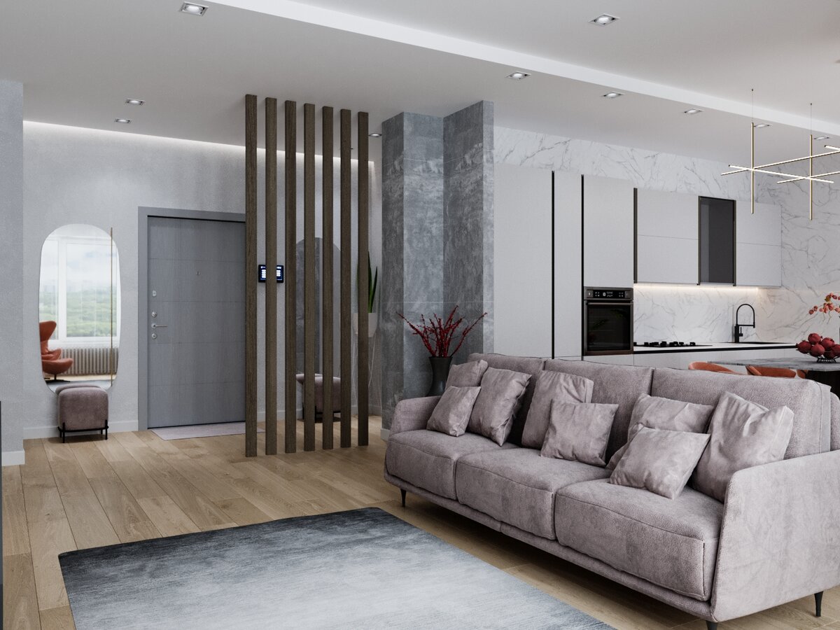 Прихожая Сразу стоит отметить, что по желанию наших заказчиков мы сделали небольшую планировку. Разделив, тем самым, некоторые зоны. А прихожую мы решили отделить вот такими рейками, чтобы проникал естественный свет. Был другой вариант - отделить её, например, шкафом, но мы с хозяевами решили от этого отказаться. Из прихожей мы попадаем в гостиную зону Здесь уже можно наблюдать немного ярких акцентов🤗 В дизайне используется достаточно много современных приёмов: Такое решение может быть "по-вкусу" далеко не всем. Но в вечернее время смотрится просто ши