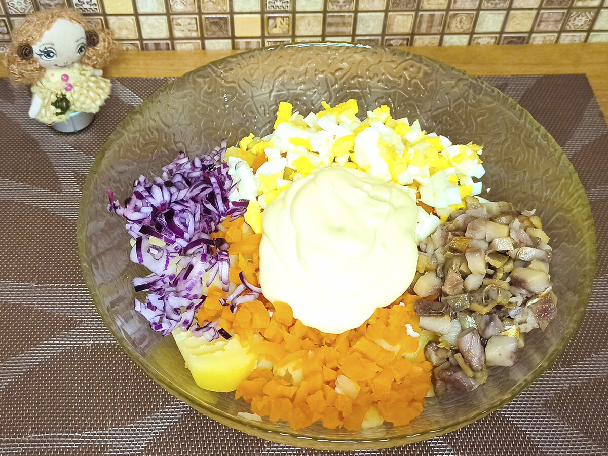 С приходом осени и наступлением холодов наши вкусы часто меняются. Летние овощные салаты приедаются, хочется чего-то более сытного и калорийного – наверное, организм просто требует топлива, чтобы легче переносить низкие температуры. ツ Есть у меня один рецепт не особенно популярного салата, который моя семья очень любит. Регулярно чередую его с оливье и другими плотными салатами. Список ингредиентов и их количество в конце статьи. ПРИГОТОВЛЕНИЕ Отвариваем картофель, морковь и яйца. Очищаем от кожуры и нарезаем маленькими кубиками. Лук нарезаем очень мелко. Снимаем шкуру с рыбы, отделяем филе от хребтовой кости, удаляем все мелкие косточки и режем на мелкие кубики. Копчёную сельдь легко можно заменить скумбрией – разница во вкусе готового блюда слабоощутима, а в таких случаях я обычно предпочитаю более дешёвый вариант. Соединяем все ингредиенты в салатнице, солим по вкусу и заправляем майонезом. Тщательно перемешиваем, после чего отправляем в холодильник минимум на 1 час. Это нужно для
