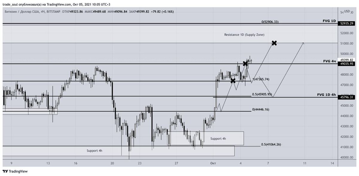 Продолжаем идти по плану от 1 октября, вчерашний пролив к 46900 быстро выкупили покупатели, и на импульсе пробили FVG 4ч ТФ, и смогли закрепить цену выше. Капитализация рынка 2156 млрд., индекс доминирования 42.77% Индекс страха и жадности перешел в режим жадности и находится на отметках 59. По фундаментальным факторам сейчас все довольно хорошо, хешрейт после китайского давления почти полностью восстановился, объемы транзакций по битку бьют исторические максимумы, каждый день появляется информация о новых инвесторах, которые или уже вошли, или начинают по-новому смотреть на крипту. BTC движется четко по плану от 1 октября - 2 цели уже собрали, о которых я говорил, осталась одна цель - зона сопротивления и зона выгодных продаж 51053 - 52738. На данный момент видится 2 варианта исхода событий: 1.Дальнейший поход с текущих, без откатов к Сопротивлению 1Д и зоне выгодных продаж 2.Откат цены на дозаправку к FVG 1D и 4h на отметках 45796, чтобы разгрузиться, и после чего уже полноце