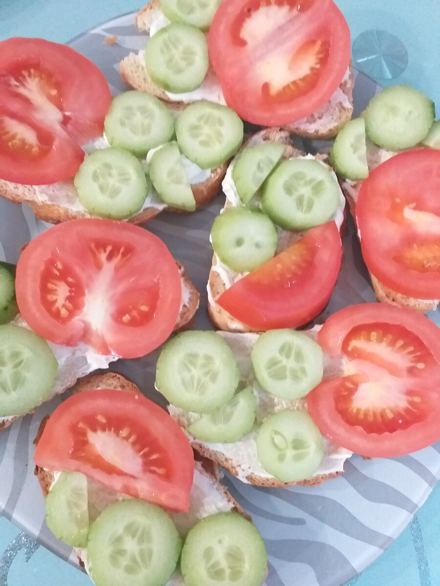 Ингредиенты: Батон нарезной-1 шт. Сметана(или майонез)-200 гр. Огурец 2-3 шт. Помидор 3-4 шт. Чеснок -1 зубчик Растительное или сливочное масло для обжарки Батон нарезать ломтиками толщиной около 1 см, обжарить с двух сторон в небольшом количестве растительного или сливочного масла. Сметану смешать с мелко порубленным или пропущенном через чеснокодавилку чесноком ,можно делать и без него. Огурцы и помидор нарезать ломтиками толщиной 0,5 миллиметра. На остывшие ломтики батона намазать тонким слоем подготовленный соус и уложить плотно друг к другу огурцы и помидоры, комбинируя их по своему усмотрению. Сверху слегка посолить. Казалось бы, примитивные бутерброды, но действительно очень вкусные! Приятного аппетита!