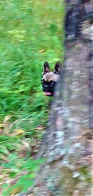 Ну, и третий этап - стали повторять команду "кру-кру-кру" уже на прогулках, в лесу, вокруг деревьев.