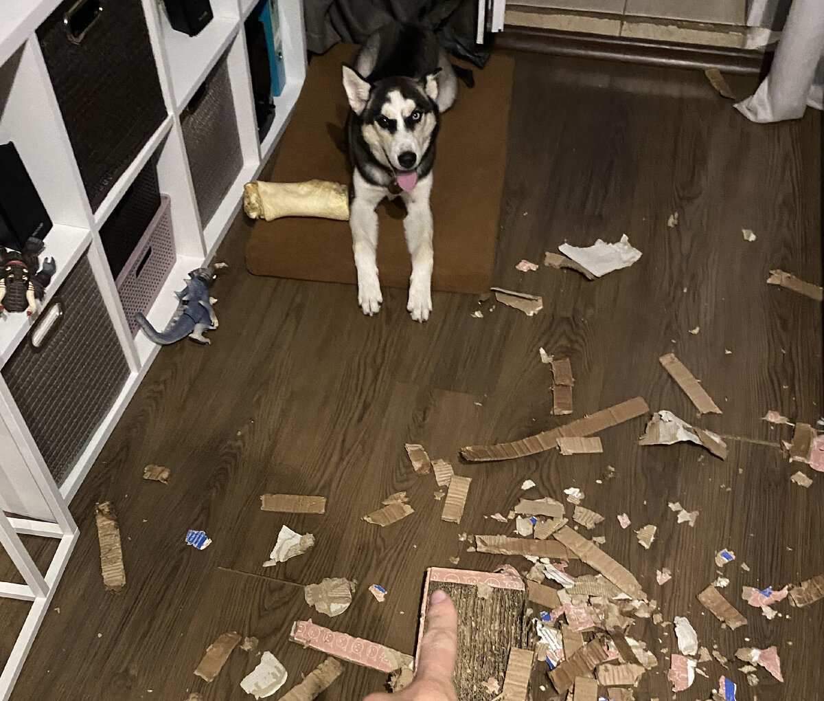 Мы к этому были готовы, поэтому, можно сказать, виноваты сами :) Как я писала в этой статье, когда мы оставляем собаку дома одну - закрываем ее на балконе. Он просторный, там много света и отличный обзор на улицу. Но все же погрызть и уничтожить то, что плохо лежит собака успела за те 5 месяцев, что живет у нас :) Чаще всего это случалось, когда я уходила из дома буквально на 15 минут, оставляя ее в комнате и думая, что она нагулялась, набесилась, наелась, а значит не будет ничего грызть. Наивная я! Первый разгром случился, когда Эске было 4 месяца: Еще через месяц продолжила хулиганить и на мелкие куски погрызла кошкину "когтеточку": А потом, когда я рано уехала из дома, а муж крепко спал и ничего не слышал, позавтракала ковриком: А когда ей было 6 месяцев, она зачем-то изничтожила свое место :D Сейчас Эске 8 месяцев, и пока все в доме остается в целости. Но, честно говоря, у меня нет рецепта, отработанного на нескольких собаках, который точно бы работал. "Эксперты" советуют что-то