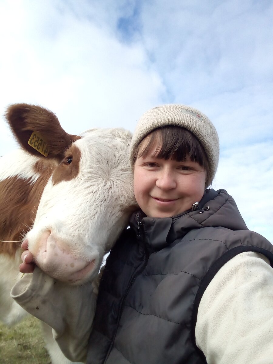 Ромашка телочка породы Симментал, это мясо молочное направление, коровы весом до тонны, удой до 30 литров молока в день. Увидев в местном паблик чате предложение на совместную закупку телят с Алтая не раздумывая присоеденилась, деньги были отложены на ремонт кухни, "да и Бог с ним" решили мы 😄 ремонт подождёт!! И вот после двух недель ожидания наша красотка приехала, это было зимой, в январе, в самые морозы, встречали мы её на федеральной трассе, ночью, я уже буквально на 9 месяце беременности, но меня это не остановило 🥴 И вот подошла машина, все кто приехал за телятками столпились возле задних дверей грузовика, а с той стороны телята тоже столпились, и начали напирать на двери, они практически сутки ничего не ели в пути, их даже не поили! так они лучше переносят дорогу, ну короче, как только ворота открылись один из телят который был в первых рядах буквально падает нам с мужем на голову😂😂😂 Он в шоке!! а я ору: Тащи в машину это наша😂 вот так мы и "выбрали" Ромашку а точнее