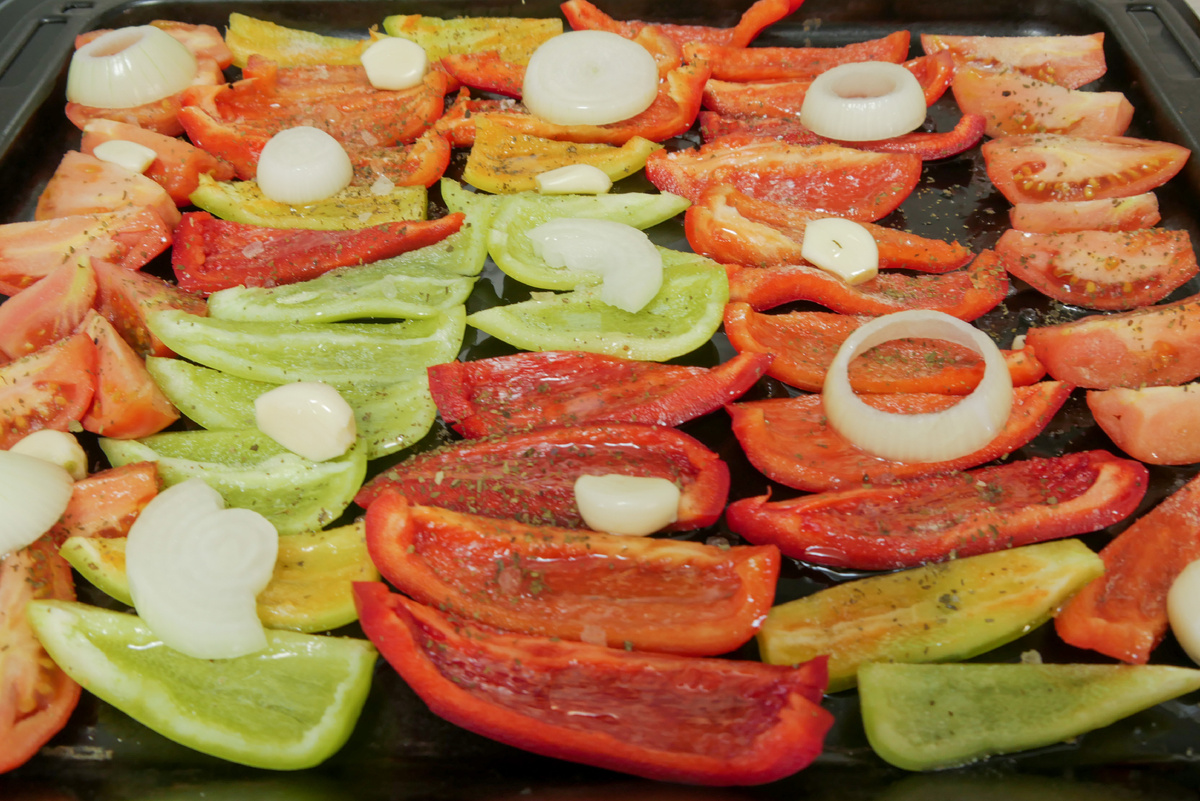 Заинтересовались? Тогда, листайте ниже. Берем 6-7 шт. болгарского перца, помидоры 1-1,2 кг, чеснок (количество по вкусу), лук репчатый 1-2 головки. Перец, помидоры нарезаем дольками, очистив их от плодоножки, чеснок оставляем целыми зубчиками, лук нарезаем толстыми кольцами. Противень поливаем оливковым или растительным маслом, выкладываем все овощи и небольшую часть помидор одним слоем, посыпаем солью, перцем, базиликом, сверху тоже слегка поливаем маслом и ставим запекать в духовку при 160 градусах на 50 минут. В это время оставшиеся помидоры (700 г) измельчаем блендером, перекладываем в кастрюлю, увариваем в течение 15-20 минут, добавляем 0,5 стакана растительного масла, доводим до кипения. Затем солим, перчим по вкусу, можно добавить лавровый лист, перемешиваем. Достаем из духовки овощи, раскладываем их по баночкам (баночки я предварительно обдала кипятком) так, чтобы все овощи попали в баночку, добавляем 1/3 ч. л. уксусной эссенции, заливаем помидорной заливкой, закручиваем баночк