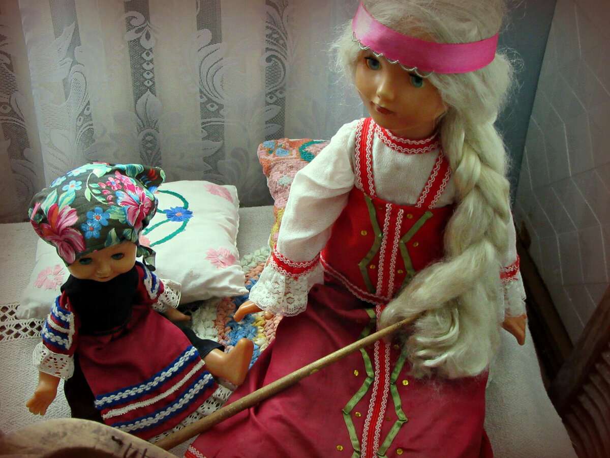 На работе у меня есть музейный уголок, посвящённый старинному быту. А в нём живут обитатели - #куклы в русских костюмах и забавный домовой. Не так давно в регионе отмечался День национального костюма, и к этой дате в музейном уголке появилась ещё одна обитательница, для которой я сшила костюм в стиле нашей местности. Показываю: Эти красны девицы - старожилки. Присматривают за хозяйством, особенно когда остаются одни во всём здании))) Но сейчас речь не об этом, а об их нарядах))) На куклах стилизованные русские костюмы: рубашка, расклешённый сарафан и поверх него душегрея без рукавов - на большой кукле; рубашка, однотонный сарафан закрытого покроя и фартук - на маленькой. Костюмы такого типа были свойственны разным регионам. А теперь детально рассмотрим костюм новенькой обитательницы, он соответствует традиционному старинному женскому наряду нашей местности. Итак, в старину местные женщины носили длинные льняные рубашки, которые украшались по вороту и рукавам. В данном случае оформле