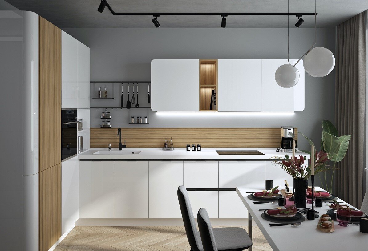Интерьеры в скандинавском стиле уже много лет популярны во всем мире, и, в частности, в России. Северный климат схож с нашим, у нас также немного солнечных дней, поэтому и нам хочется наполнить темные квартиры светом. К тому же, скандинавскому стилю присущи функциональность, обилие натуральных материалов, они вполне могут быть реализованы без больших вложений, что не может не вызывать симпатию. В нашем новом материале подборка стильных идей по оформлению кухни в скандинавском стиле. 1. Светлая кухня со скрытыми ручками от «Стильные Кухни». Прекрасный пример того, как сочетая такие фактуры, как глянцевые фасады, древесный декор, элементы из искусственного камня, можно остаться в рамках минимализма и создать стильный, но не вычурный декор. В этой модели не предусмотрены шкафы до потолка, что характерно скандинавскому стилю – это оставляет дополнительное пространство. Кроме того, их можно использовать как дополнительные полки и разместить предметы декора вроде цветочных горшков. 2. Кухня-