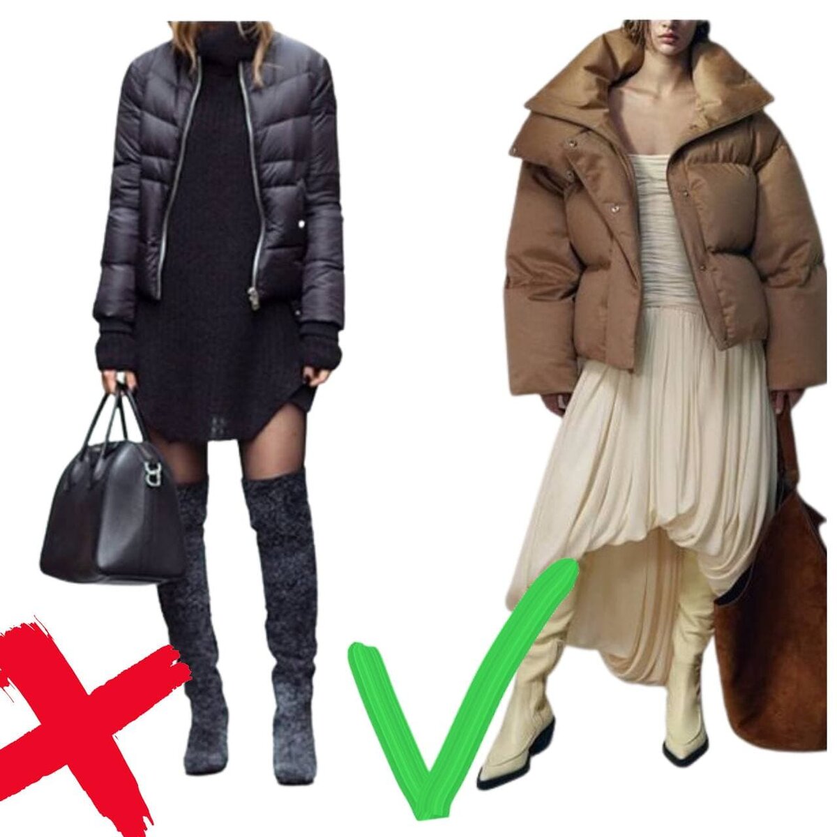 Зимой перед многими женщинами встает вопрос: какой выбрать пуховик? Как быть? Предлагаем разобраться с нюансами образов из юбки и пуховика, ведь если научиться их правильно сочетать между собой, необходимость в очень длинном пальто пропадет. Рассказываем, как подружить пуховик и юбку Короткие пуховики отлично сочетаются с юбками любой длины. Первое правило - низ не должен быть облегающим. Следовательно: Второе правило: пуховик средней длины + юбка средней длины. При этом важно прикрыть колени и подчеркнуть талию. Для этого идеально подойдет модный пуховик на запах или в виде рубашки. Дополняем кожаным ремнем. Третье правило: единство цвета. Составляя такой сложный и неоднозначный наряд, как пуховик с юбкой, не стоит усложнять комплект цветом. Избавляемся от лишних горизонталей с помощью выбора близких оттенков. К примеру, черный и коричневый, синий и голубой, красный и коричневый. Правило четвертое: неприталенный крой. Основная проблема большинства зимних образов заключается в вер