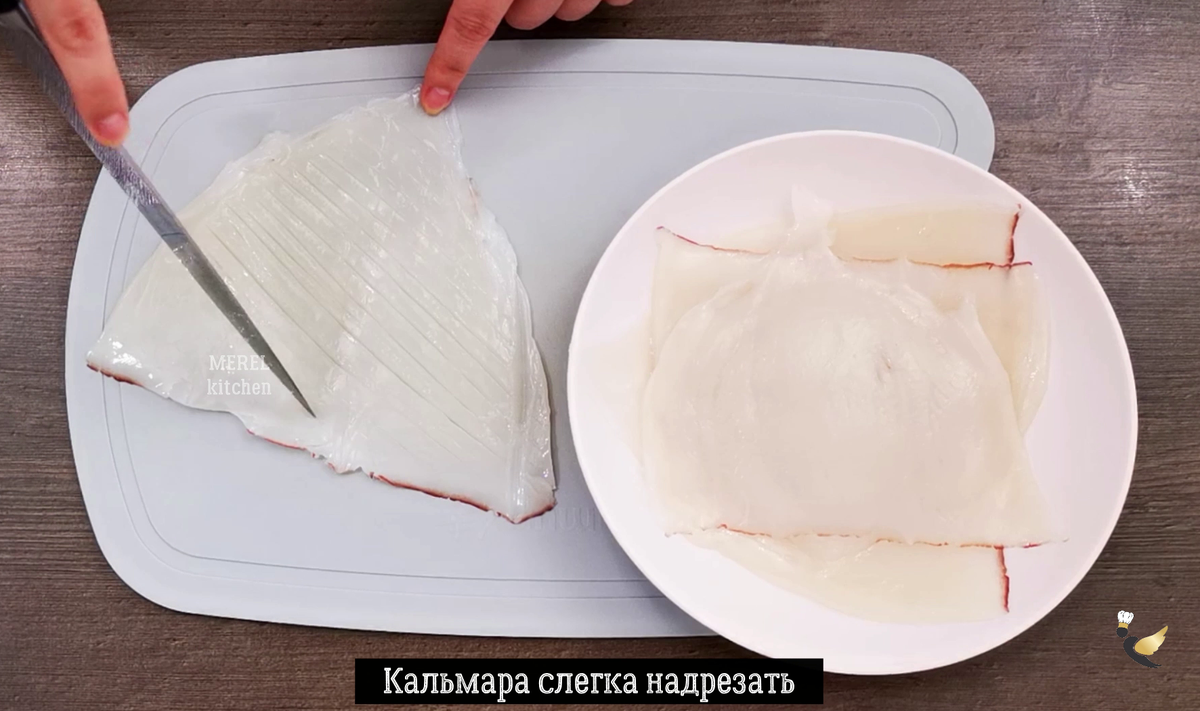 Разрезы делаю по длине и ширине. Нужно это для того, чтобы кальмар получился более нежным и лучше пропитался вкусным соусом.