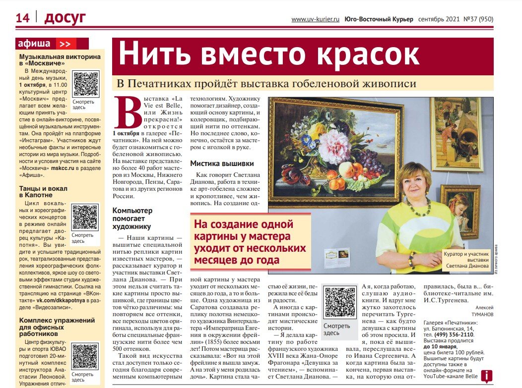 Газета "Юго-Восточный Курьер" опубликовала статью о нашей выставке вышитых картин проекта "Жизнь прекрасна!" в Галерее ПЕЧАТНИКИ - К сожалению, статья содержит некоторые неточности и фото добавили с нашей самой первой выставки в КЦ "Марьина Роща", но в целом отличная новость и спасибо за PR! У нас уже есть несколько посетителей, которые специально приехали в Печатники, прочитав эту статью ))) Также анонс нашей выставки опубликован на сайте КУЛЬТУРА.РФ 💝💝💝 Выставка нашего совместного авторского проекта "Жизнь прекрасна!" и Музея-галереи Живописной Вышивки проходит с 1 октября по 10 января 2022 года, под эгидой Академии Народного Искусства России, секция «Искусство Художественной Вышивки», в стенах Галереи ПЕЧАТНИКИ Объединения Выставочные Залы Москвы Адрес: г. Москва, Батюнинская ул., д.14, м. «Печатники» Часы работы: вт-вс 11:00-20:00 Вход ПЛАТНЫЙ (билеты необходимо заранее приобретать на сайте - https://vzmoscow.ru/ ) Как добраться: от метро «Печатники», автобус 348 до кон