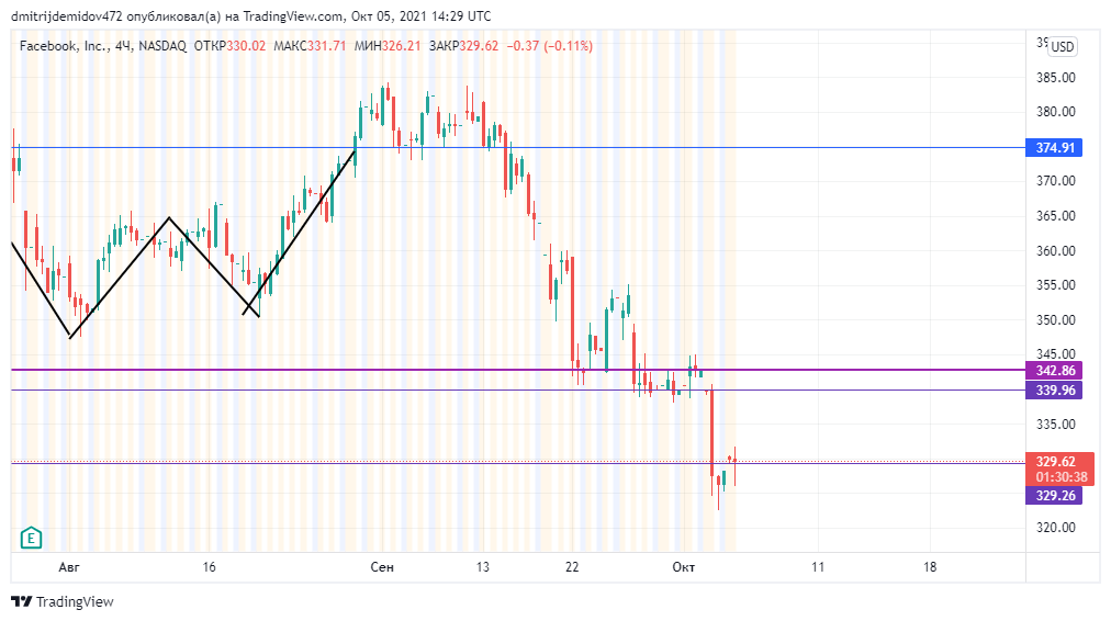 Фондовый рынок США открылся сегодня в позитиве. Однако, он четвертый день подряд по индексам ходит в боковом движении. Я сейчас не уверен, что сегодняшний рост даст толчок к следующему возвышению рынков, но посмотрим, как рынки будут вести себя завтра. Сейчас же я хочу взглянуть на эти компании. Акции Facebook: Я не могу обойти вниманием акции Фейсбук, у которых вчера был 6 часовой сбой по всей планете. Вы и сами могли заметить, что у вас могли перестать работать приложения, связанные с Фейсбуком. Это вызвало падение акций. Хотя постойте! По факту акции падали и до этого! Это вам аналитики и медиа будут говорить, что сбой вызвал просадку. В действительности он лишь ее ускорил и мы находимся возле уровня поддержки. На 4 часовом графике есть уже сигналы на откупы и я вошел бы сюда, с выставленными стоп лосс приказами чуть ниже. Акции ExxonMobil: Входить в нефтяников я еще говорил до готовящегося пробития, но также должен вас уведомить о том, что планируется дальше. Цена стремится выше