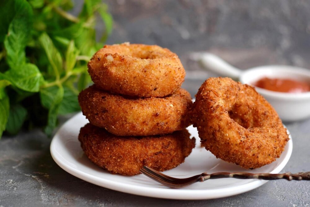 Готовим вкусное ресторанное блюдо —луковые кольца с моцареллой. Жарятся кольца во фритюре, получаются румяными и хрустящими за счет плотной панировки. Для этого луковые кольца панируем в муке и два раз в яйце и сухарях. После теплообработки сыр моцарелла полностью расплавляется, делая кольца лука очень сочными и мягкими. Ингредиенты: Приготовление: Головку репчатого лука среднего размера нарежьте кружочками шириной не менее 1,5 см. Разделите каждый кружочек на отдельные кольца. Мягкий сыр моцарелла нарежьте тонкими пластинками. Соедините два кольца с разницей в ширине 0,3-0,5 см, в середине сделайте прослойку из сыра. Не делайте очень большие промежутки между кольцами лука, чтобы сыр не выпадал при панировке. Каждую заготовку поочередно опустите в муку со всех сторон. Яйца расколотите до однородности в отдельной емкости, посолите. В чистую смесь опустите кольца, запланированные в муке. Далее кольца запанируйте в измельченных сухарях со всех сторон. Чтобы панировка получилась плотней, о
