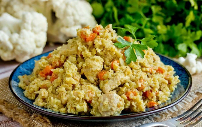 Попробовав это необычное блюдо, мало кто с первого раза догадается, какой ингредиент является его основой. Внешне оно похоже на плов или кашу из какой-то крупы с куриным мясом. По вкусу вроде бы овощная составляющая угадывается, но то, что это именно цветная капуста, — тут уж нужно постараться распробовать.) Ингредиенты (на 3 порции) Цветная капуста (разобранная на соцветия) — 500 гКуриные бёдра — 430 г (или 330 г куриного мяса без кожи и костей)Лук репчатый — 100 гМорковь — 100 гЧеснок — 1 зубчикКарри (приправа) — 1 ч. ложка с горкойМасло подсолнечное — 50 млСоль — по вкусу ПОШАГОВЫЙ РЕЦЕПТ ПРИГОТОВЛЕНИЯ ШАГ №1 Подготовьте необходимые ингредиенты. Для этого рецепта лучше всего использовать мясо куриных бёдрышек, но можно взять и филе. ШАГ №2 Чеснок очистите и нарежьте пластинками. ШАГ №3 В сотейнике или казанке разогрейте подсолнечное масло и обжарьте на нём чеснок до золотистого цвета. Затем чеснок из масла извлеките. ШАГ №4 Лук и морковь очистите. Нарежьте овощи кубиками. ШАГ №5 Выл