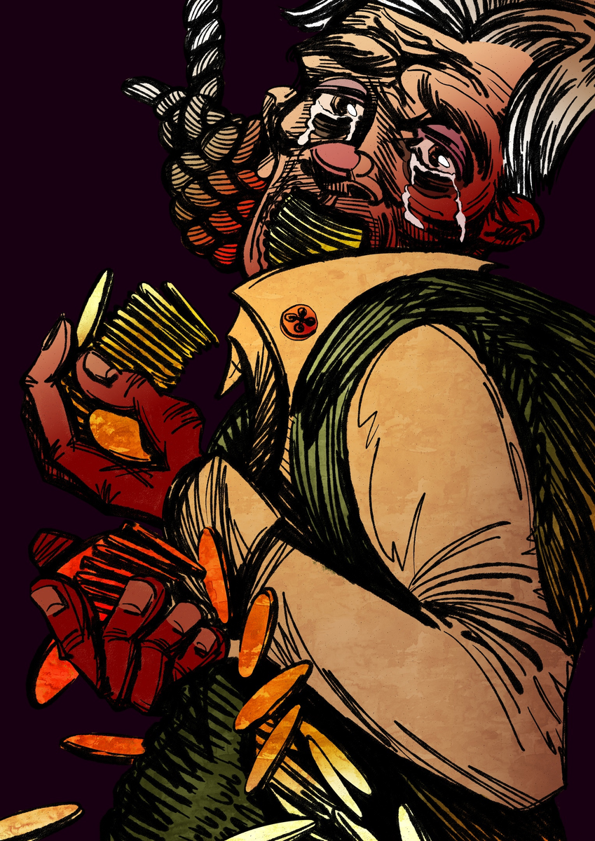 Кон подошёл к мешку и начал класть в широкие карманы брюк золотые монеты не понимая, какую роль они сыграют через пару минут. Дрожь не прошла, потому несколько монет упали с глухим звоном. Набив карманы, он засунул семь монет стопкой себе в рот. Посмотрел на детей, пролил слезу и повернулся.