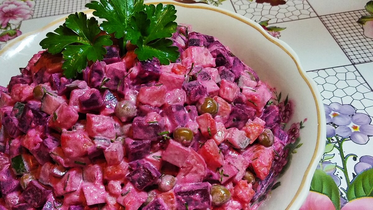 Яркий и незатейливый салат "Осенний каприз". Здравствуйте, Дорогие Хозяюшки! В сезон овощей решила поделиться с вами овощным салатом "Осенний каприз". Это очень вкусный салат, простой по составу и лёгкий в приготовлении. О пользе овощей все мы знаем с детства. Кроме того, овощи-это очень вкусно! Салаты из овощей идеальны как на каждый день, так и для праздничного стола. Итак, яркий и незатейливый салат "Осенний каприз". Нам потребуется: Морковь, свёклу, картофель - необходимо отварить, остудить и очистить от кожуры. Затем все овощи и колбасу нарезаем небольшими кубиками. Все компоненты соединяем в миске. Добавляем зелёный горошек. Заправляем салат майонезом, добавляем соль по вкусу. По желанию можно добавить мелко нарубленный укроп. Хорошо перемешиваем. Салат "Осенний каприз" готов! Приятного аппетита! Если вам понравился рецепт, ставьте лайки, пишите комментарии и... не забудьте подписаться. В моей кулинарной тетради есть ещё много интересных рецептов 🥣🍰🥐🥨🍞🍩.