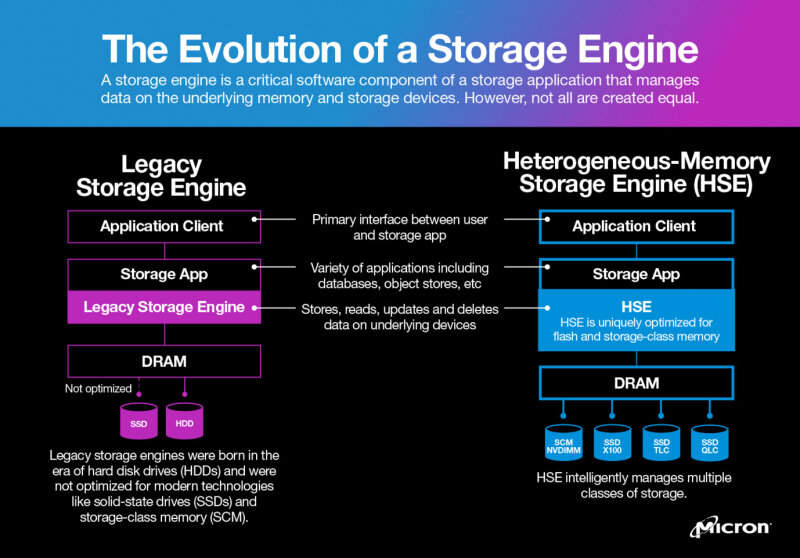 В апреле 2020 года компания Micron анонсировала свой собственный механизм хранения с открытым исходным кодом, предназначенный для совместного использования SSD, SCM и DRAM. А теперь компания показала вторую версию системы — HSE 2.0 (Heterogeneous-Memory Storage Engine). HSE, согласно изначальной задумке, позволил бы приложениям — СУБД в первую очередь — задействовать весь потенциал быстродействующих накопителей и памяти. В первой версии использовался модуль ядра MPool, обслуживающий хранилище, с которым напрямую работали модифицированные приложения. Таким образом обходился стандартный стек ФС, что положительно влияло на производительность из-за отсутствия накладных расходов. Очевидный минус такого решения — для массового распространения технологии модуль MPool должен был закрепиться в основной ветке ядра Linux, чего, как теперь стало понятно, не произошло. Во второй версии от модуля MPool отказались, теперь движок «живёт» строго в пространстве пользователя, а не ядра, и задействует ста