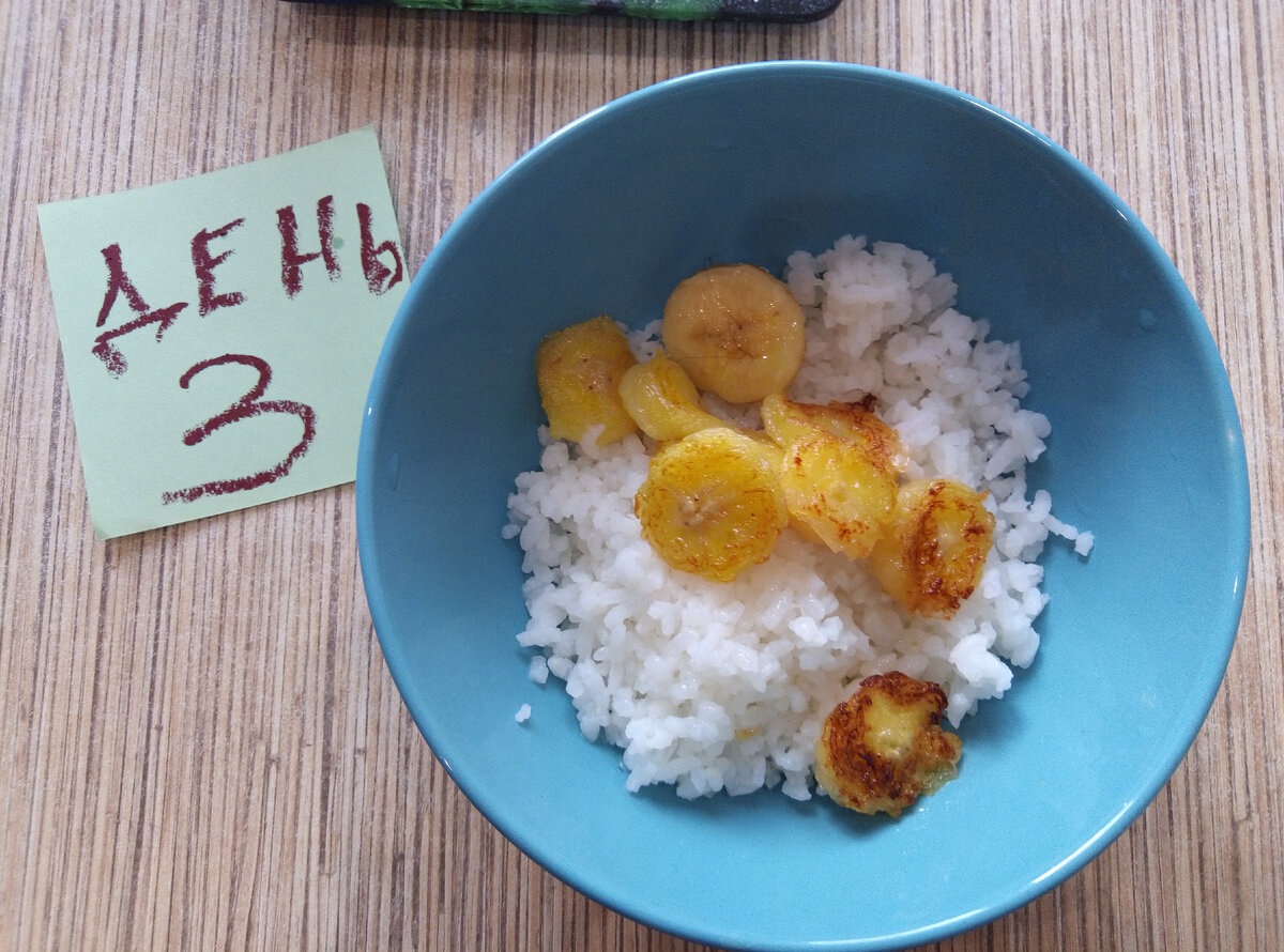 3 день Завтрак Рис 150г. с жареным бананом 50 г. + чай Бананы на сковородку в растительное масло и жарить минут 7-10. Остатки банана нарезала кружочками и положила в морозилку Обед Суп с "лапшой", который я сделала ещё в первый день + банановый чай (рецепт чая тут) Вкус у моего "чая" получился очень специфический. Ужин Пшённая каша на воде с солью, сахаром + чай Так же съездила в магазин за сковородкой, и купала тыкву. Что-нибудь приготовлю из неё. После последней закупки, которая здесь , у меня было 218,65 ₽ - 49,82 ₽ (тыква) Осталось: 167.03 ₽ Сегодня, 4 день Завтрак Пшённая каша 100 г. блины на воде с чаем Обед Последняя порция супа с "лапшой" , на второе - рис Ужин Блины + чай Если в моём тексте нашли ошибку, сообщите мне об этом, пожалуйста Всем хорошего дня! Для удобства ссылки на прошлые дни оставляю тут Самая первая закупка День 1-2. Меню и вторая закупка #еда #экономия бюджета #1000 рублей #рацион питания #меню на день
