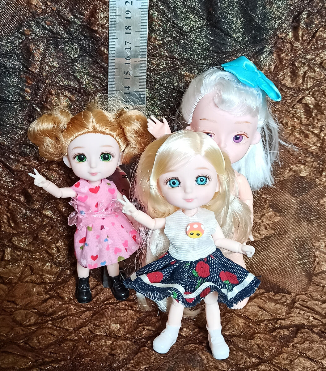 Доброго времени суток всем заглянувшим! В этой статье я расскажу о самых чудесных куколках, которых я когда-либо покупала на Алиэкспресс. Их рост - всего 13 сантиметров, они меньше куколок Баболи, которые уже давно пользуются большой любовью многих кукольников. Если Вы из их числа - то их младшие сестренки Вам точно понравятся. Стоят такие девочки всего 273 рубля, в комплект входит простенькое платьице и крохотные кроссовочки. Кстати, этим милашкам подходит обувь для Челси с Али. У них совершенно ангельские личики, одна крохотная ручка показывает знак V, а вторая сжата в кулачок. Подвижность такая же как у Баболишек, качество пластика тоже идентичное. Шарниры нормальные. Теперь о недостатках: у девочек стандартная китайская прошивка по кругу. То есть придется допрошивать. Но есть и хорошая сторона: волосы мягкие и хорошего качества, так называемые молочные трессы. Поэтому можно просто частично допрошить лысину и все. И еще одна хорошая новость. Отдельно продаю