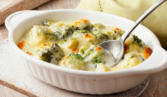 Выложите кусочки капусты в форму, залейте их сливочной смесью и ставьте выпекаться на 15 минут. Затем посыпьте второй частью сыра и кунжутом.