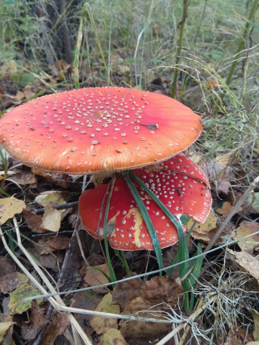 Гуляя по осеннему лесу, мы наткнулись на грибы. Конечно, это не те грибы, которые хотелось бы найти, но они так завораживали своей сказочной красотой, что несмотря на их ядовитую характеристику, очень сложно было отвести свой взгляд. Среди мрачной осенней листвы, эти шляпки, словно в праздничных нарядах, красовались на осеннем балу. Не знаю почему, но они все были по парам, причем около большого мухомора обязательно красовался маленький мухоморчик, им даже кто-то успел полакомиться. Интересно, кому не страшны ядовитые свойства этого гриба? Удивительно то, что откусанные шляпки были только у тех грибов, которые поменьше, неужели они повкуснее? Нам повезло: помимо мухоморов удалось еще найти огромное дерево боярышника, оно все было усыпано яркими бордовыми плодами. А так как свойства боярышника в основном, успокоительные, а наша жизнь волей-неволей наполнена ежедневными стрессами, то мы быстро принялись собирать ягоды. Все это делалось для того,чтобы потом, долгими зимними вечерами з