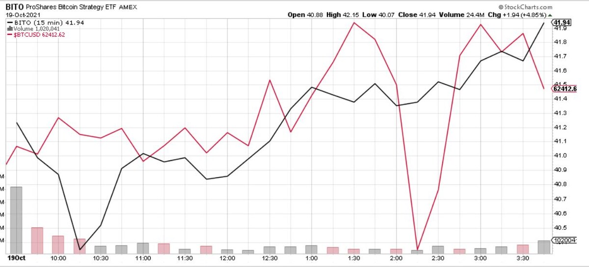 Запуск первого американского ETF, отражающего стоимость биткоина, ProShares Bitcoin Strategy ETF (BITO), продемонстрировал исторический объем в первый день торгов, 19 октября, который составил почти $1 млрд. ETF начал торговаться на Нью-Йоркской фондовой бирже (NYSE) по цене $40,88 за акцию, а в конце торговой сессии стоил $41,94 - рост 4,85%. Вместе с тем в этот период (с 9-16 по Нью-Йорку) спотовая цена биткоина выросла всего 0,65%. Торги физическим биткоином идут круглосуточно, и к 24.00 19 октября он вырос на 3,62%, до $62,412. Внизу представлены два 15 минутных графика. На первом - сравнительная динамика BITO (черная линия) и спотовой цены биткоина (красная) во время биржевой сессии на NYSE 19 октября. Различия на столько небольшом отрезке вполне ожидаемы, поскольку ETF на биткоин привязан к цене фьючерсов на криптовалюту, а не к ее спотовой цене. Второй график показывает динамику спотовой цены биткоина в течение 19 октября. На отрезке выделенном прямоугольником показано время, ко