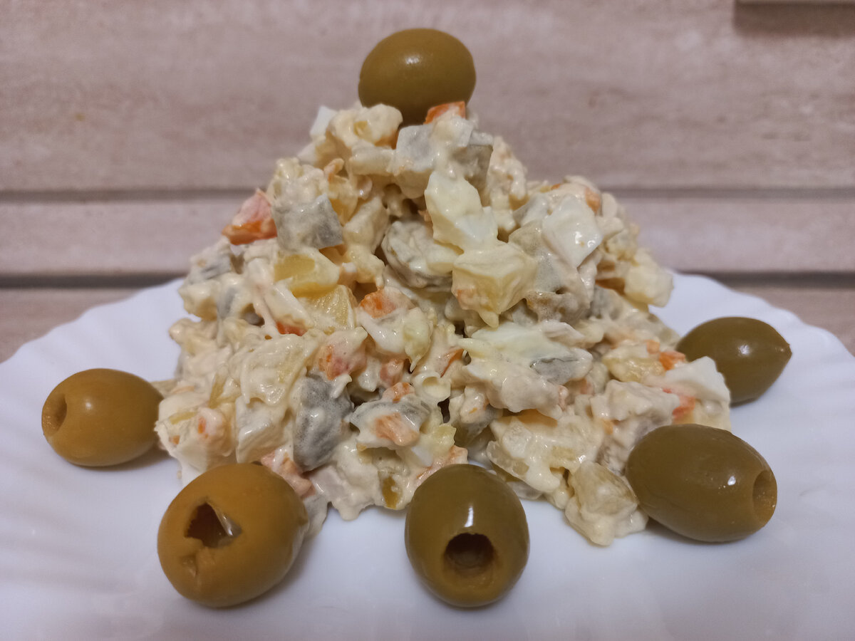 Добро пожаловать на мою кулинарную страничку! Салат "Оливье" занимает первое место практически у каждой хозяйки на праздничном столе. Во-первых, рецепт салата очень прост, его не забудешь, а во-вторых, готовится он быстро и просто. Лично у меня не обходится ни один праздник без этого блюда. Но я решила немного модернизировать его вкус и заменила один ингредиент на другой! Вкус салата получился необыкновенный! Гости "смели" его за считанные секунды! Это блюдо из тех, что поднимают настроение и создают ощущение праздника. У многих оно ассоциируется с Новым годом, но попробуйте сделать его на ужин и вы не пожалеете! Ингредиенты: Для пикантности вкуса можно еще добавить черный молотый перец по вкусу. ******************************************************************************* Приготовление блюда: 1. Куриное филе необходимо сварить в подсоленной воде с добавлением лаврового листа до готовности. Затем остудить и нарезать небольшими кубиками. 2. Отварные картофель и морковь, а так же ма